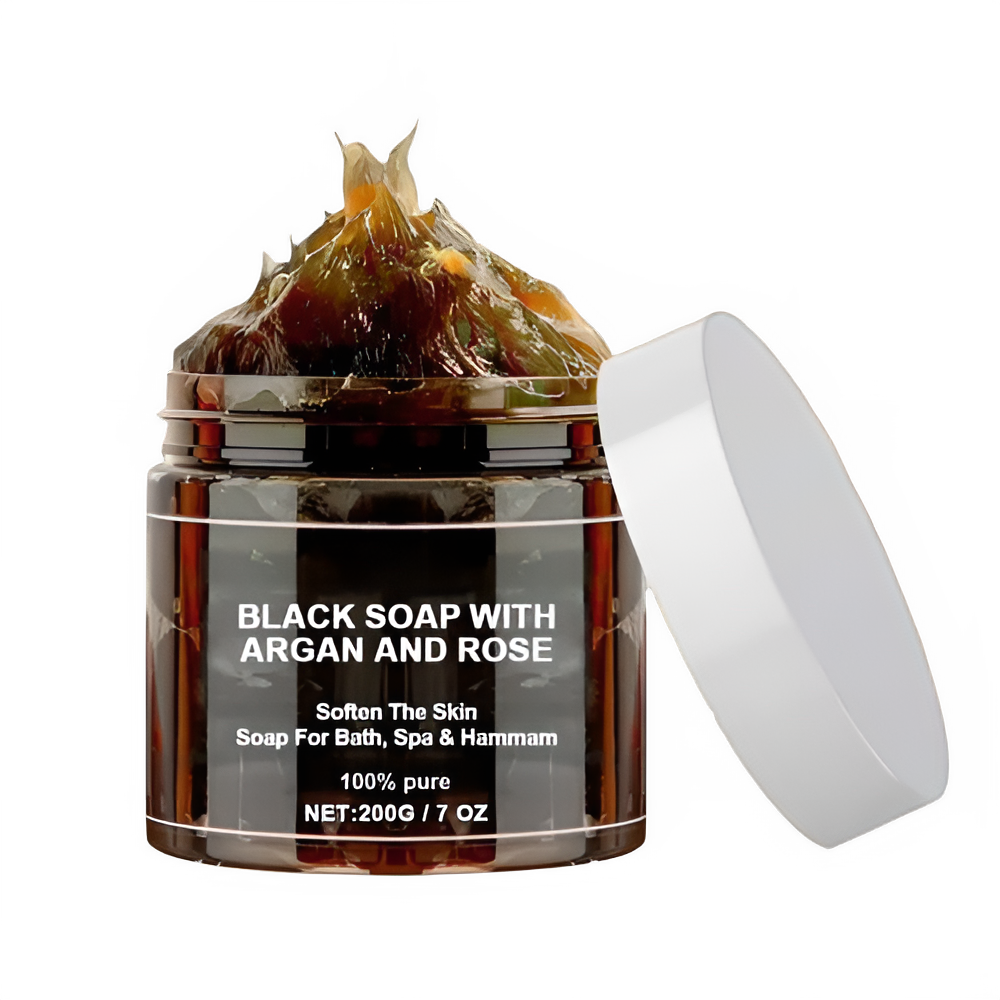 3.Indulgent Skin Fragrance: Enhance your bathing experience with our Moroccan Black Body Scrub that nourishes deeply with argan and rose oils. Enjoy long-lasting fragrance and indulgent skin cleaning, leaving you feeling rejuvenated and luxurious.