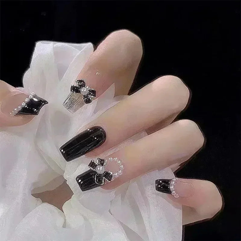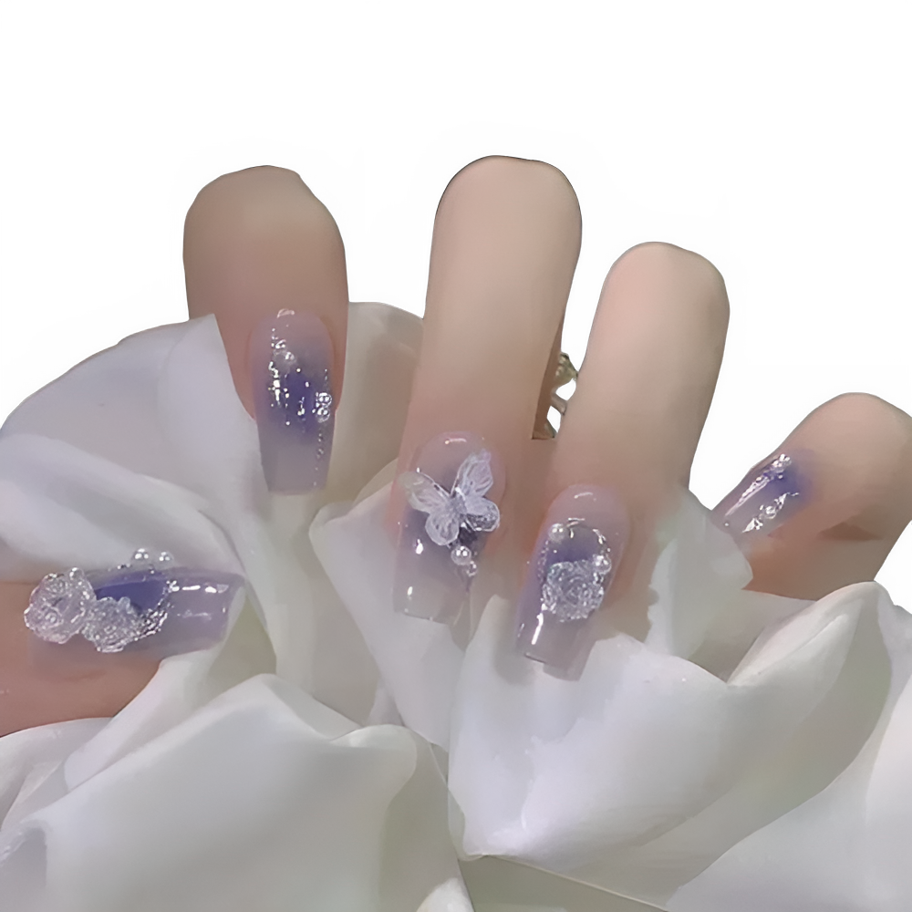 24Pcs Ballerina Long Square Nail Tips False Nails Wearable Fake Nails Butterfly Camellia Flower Pearl Design Press on Nails